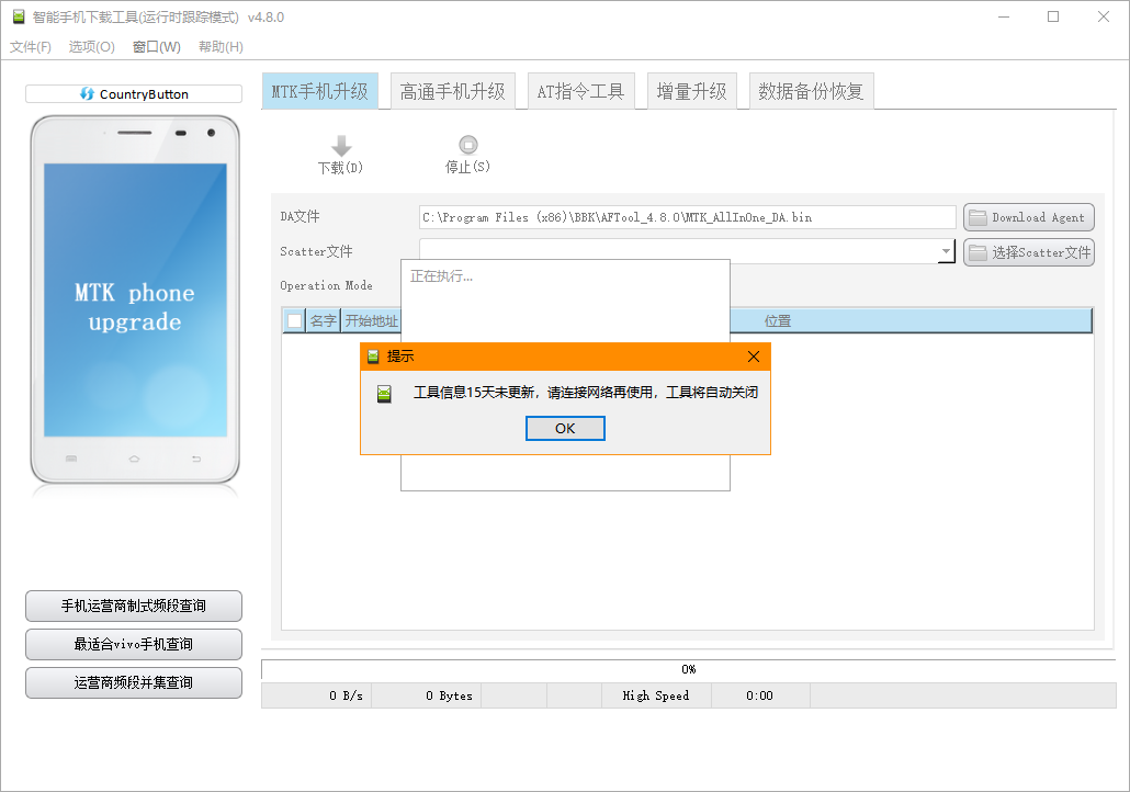 使用AFTool工具进行解锁(这个也是vivo的刷机工具),不过可惜该工具有严格的检测,提示:“工具信息15天未更新 ”会自动关闭: