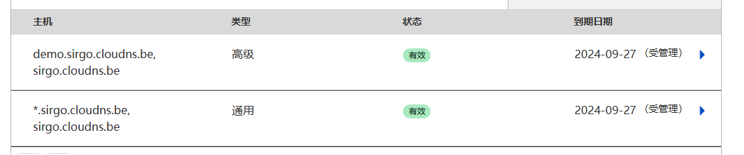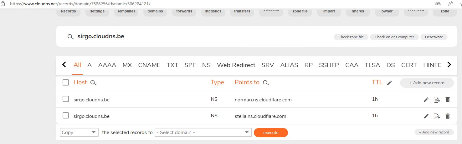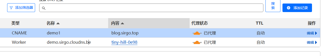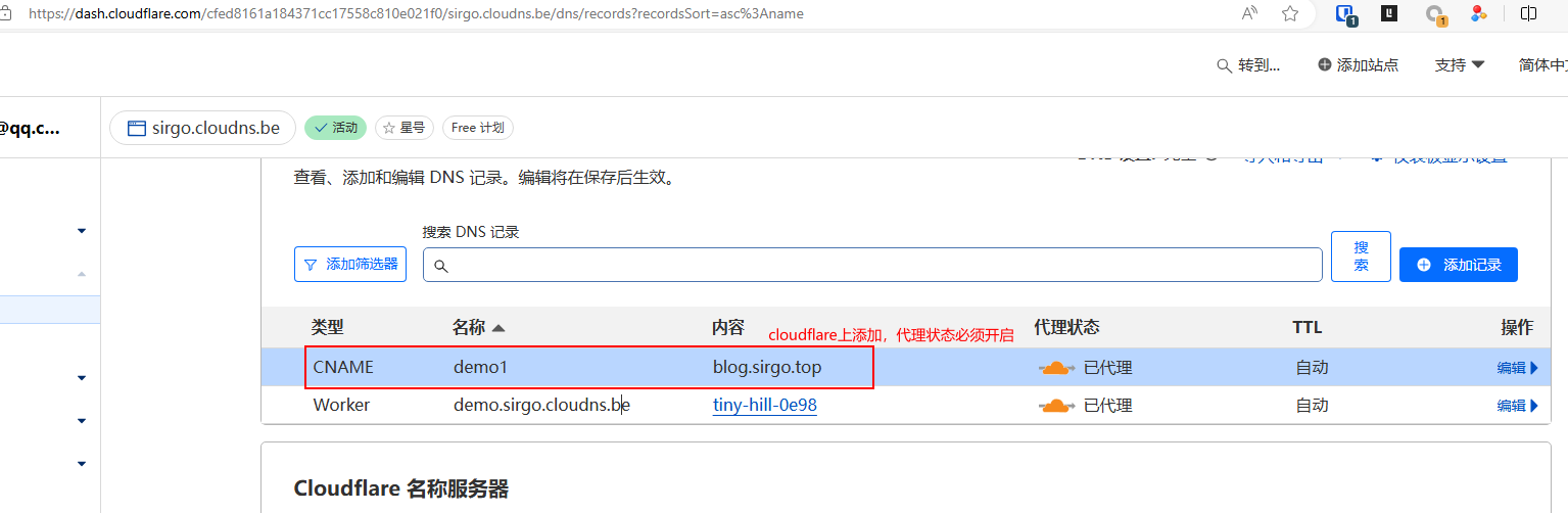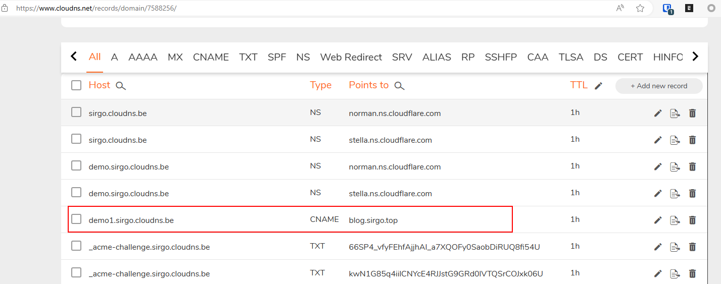添加域名:demo1.sirgo.cloudns.be 记录,可以使用A记录或cname。 注意:需要在cloudflare和cloudns上都添加才可以。我这里使用cname