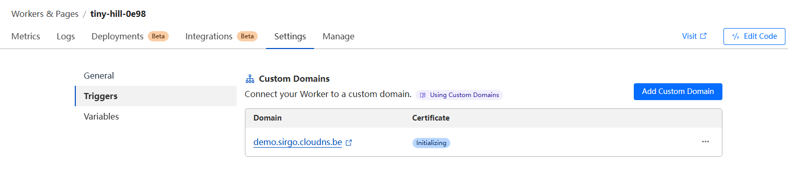 设置worker的外部域名: workers -> 设置 -> 触发器添加域名: demo.sirgo.cloudns.be