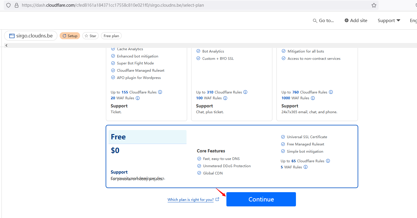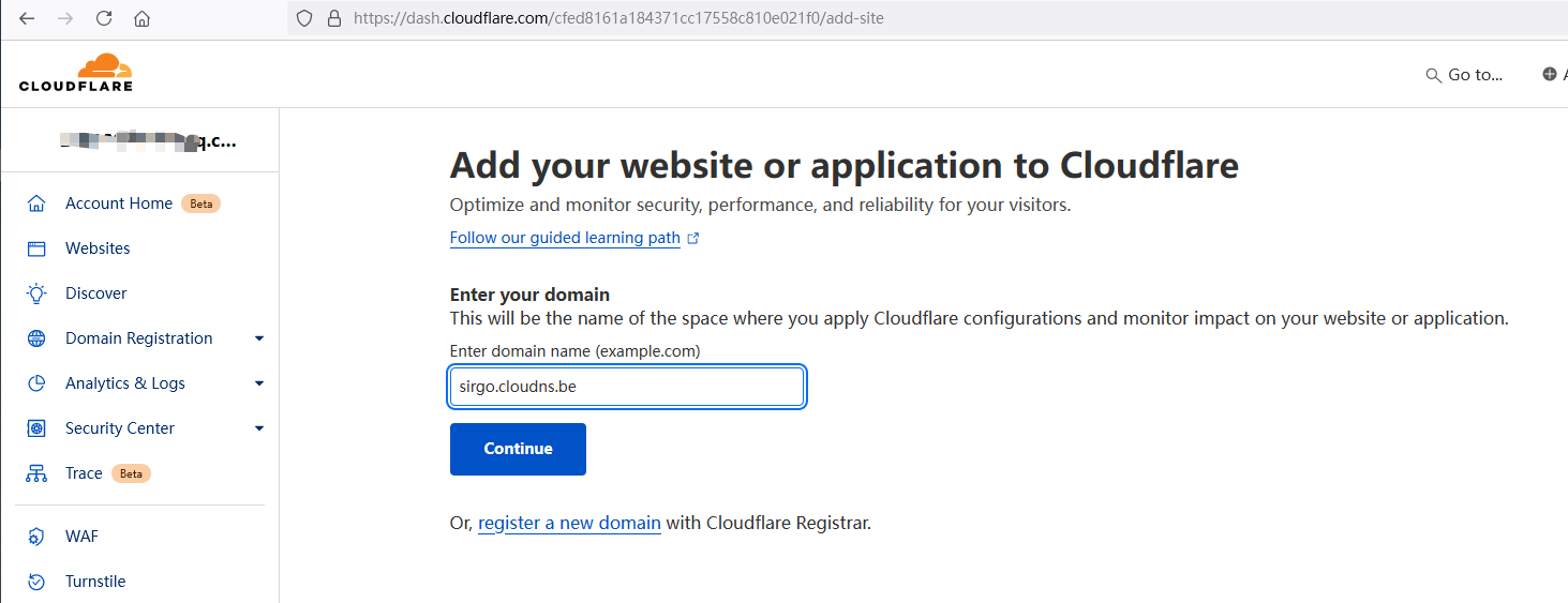 切到刚才cloudflare的界面,填写刚申请的域名,点击continue