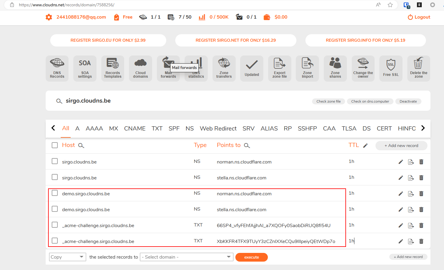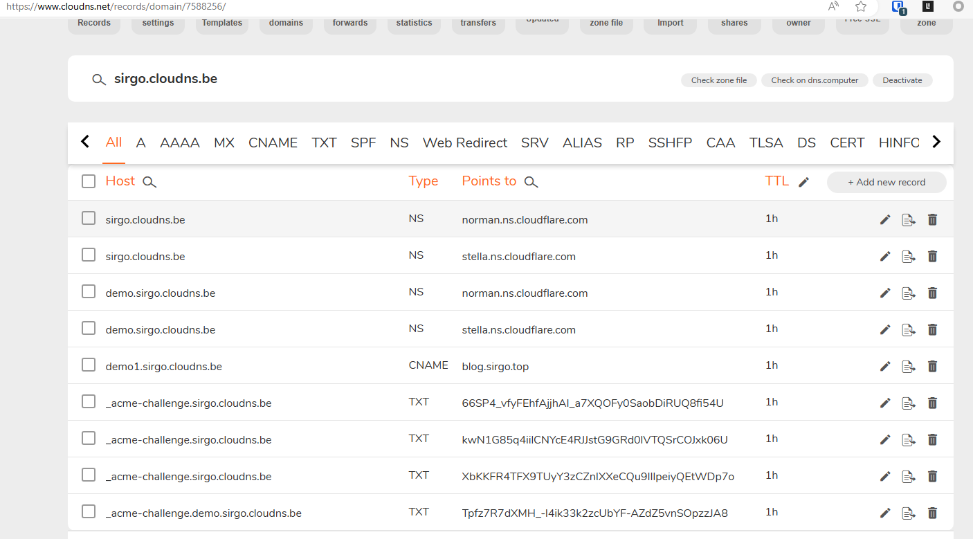 添加域名demo.sirgo.cloudns.be 的NS记录,如图添加好的TXT和NS记录 (稍等片刻,txt记录的验证有些慢,我等了大概10分钟..)