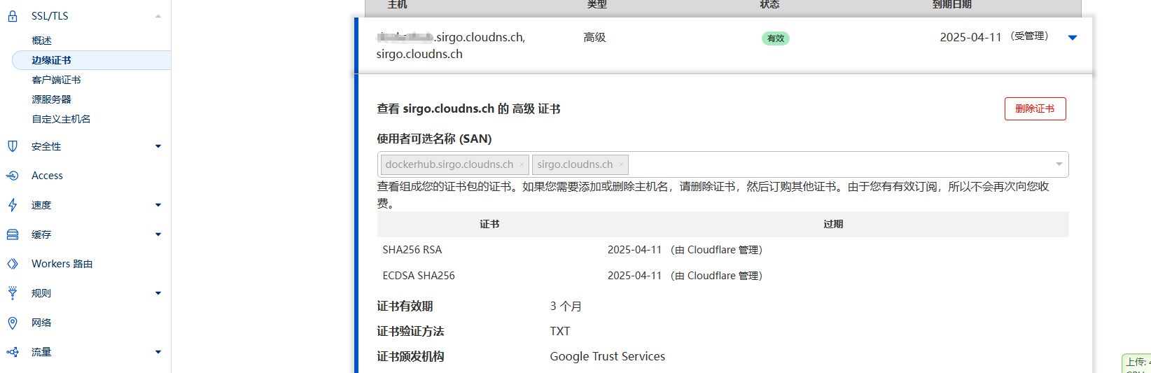重新给worker设置域名后,边缘证书处将显示如下: