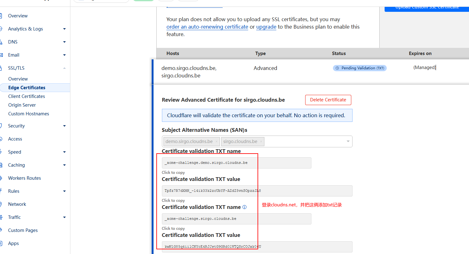 添加域名demo.sirgo.cloudns.be 的证书txt记录到cloudns