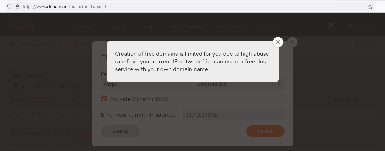 如果提示这个说明你的ip不能注册cloudns 需要挂梯子或换个ip (tips:可以使用云主机注册)
