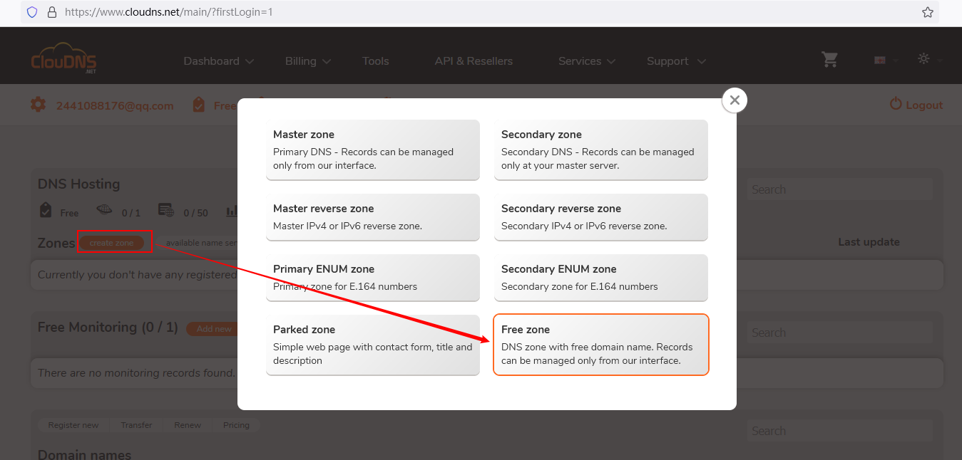 点击 “create zone”后弹框选择“free zone”