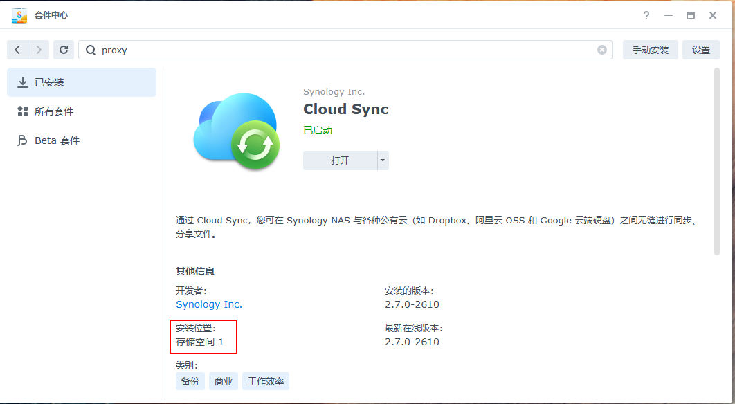 因为群晖的系统是使用raid1的镜像功能在每块硬盘上安装,一直以为其应用也是在这样。其实不是这样的,应用安装在指定的位置。如下安装在“存储空间1”