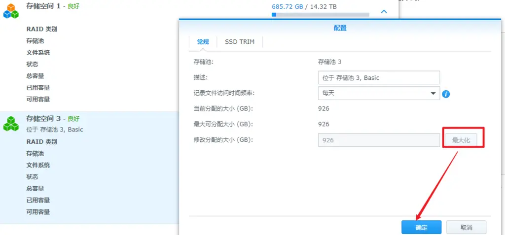 注意: 以上操作完毕后,如果是LVM类型的卷,需要扩容。 如下图点击最大或者按需。(版本:DSM 6.2.3下必须这样)
