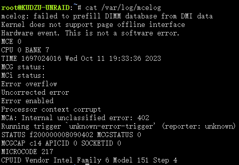 问题:12500T ES + 精粤B760 gaming开启Windows10等虚拟机(包括不限于Linux,DSM)后不定时重启,并从unraid系统日志看到一个硬件错误,mcelog显示:internal unclassified error :402